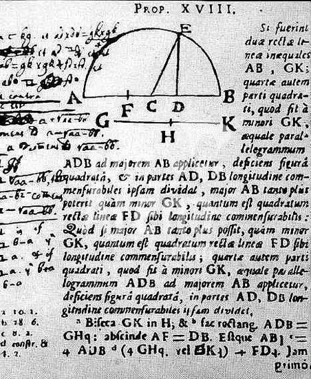 00166776 Newton, Isaac Sir, 5.1.1643 - 31.3.1727, British physicist, reproduction from his review copy of elements of Euclid with his side notes, early 18th century,