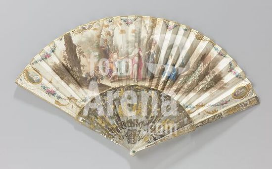 alb4494966 Folding fan, consisting of a paper sheet painted in gouache with 'The Judgment of Paris' on a mother-of-pearl frame à jour and embossed with 'metal and quatre couleurs', consisting of a paper gouache leaf painted with 'The Judgment of Paris' on a mother-of-pearl frame à jour and embossed with 'métal and quatre couleurs'. In the central show, Paris sits on a rock and holds a shepherd's staff in his left hand and hands the golden apple to Venus with his right hand. On the left behind Paris is Hermes with his characteristic staff in his hand. To the right of Venus, with amor on the left, stands Athens with helmet and spear and Juno sits with the peacock on a rock. In the left foreground two putti play with a sheep. The show is surrounded by flower garlands, fruits and gold-colored ornaments. In the top left corner a medallion with an elegant young woman dressed in a blue dress and with a blue hat on the head. In the top right corner there is a medallion with an elegant young man with powdered hair and a tail with a black bow, a pink-red frame including a gray cardigan and a white shirt. In the lower left corner a few (tortel) pigeons on a nest, in the lower right corner a few torturing pigeons. The frame consists of 22 contiguous legs, on which four cartouches with music-making and conversing couples. Putti, a trophy with a straw hat, grain sheaves and a flail are placed on the hind legs, under a man or woman with a basket of fruits. On the back of the single leaf a sitting female is painted under a tree. She is dressed in a blue robe à la francaise with a lacing at the center front. A small hat leaning forward on the head and a bouquet in her right hand. The leaf is surrounded by a garland with red roses and blue flowers. Lock pin of green colored glass in a metal setting, the Judgment of Paris (without Mercury), anonymous, France (possibly), c. 1775 - c. 1780, blad, schildering, montuur, sluitpin, steundeel, cutting, l 28.5 cm × s 51 cm.