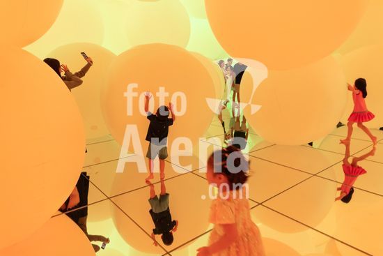 ny051224195712 **EMBARGO: No electronic distribution, Web posting or street sales before SATURDAY 5:01 A.M. ET DEC. 7, 2024. No exceptions for any reasons. EMBARGO set by source.** Visitors in a room of giant orbs where colors change when they are touched at teamLab Planets in Tokyo, Oct. 4, 2024. The art collective behind teamLab, which started in Japan, has expanded across the world, developing partnerships to pay for its immersive technology. (Shiho Fukada/The New York Times/Fotoarena)