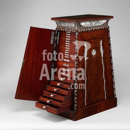 Coin cabinet. Culture: French, Paris. Decorator: Decoration after drawings by baron Dominique Vivant Denon (French, Givry 1747-1825 Paris). Designer: Designed by Charles Percier (French, Paris 1764-1838 Paris). Dimensions: Overall: 35 1/2 × 19 3/4 × 14 3/4 in. (90.2 × 50.2 × 37.5 cm). Maker: Probably by François-Honoré-Georges Jacob-Desmalter (French, 1770-1841); Silver mounts by Martin-Guillaume Biennais (French, 1764-1843, active ca. 1796-1819). Date: ca. 1809-19.The design, medium, and execution of this extravagant medal cabinet are as impressive and eccentric as the man who probably commissioned it, Napoleon, Emperor of the French (1769-1821), who at the time of its making was a step away from abdication and exile.[1] The first significant contemporary reference to it has been published by Antony Griffiths: "The most interesting record, however, is an account submitted in February 1814 by [the goldsmith] Biennais for 3600 francs, for what is described as the 'médailler du Roi.'" In Biennais's account, Griffiths continues, this medal cabinet for the king is described as "in the form of an Egyptian pedestal, containing 44 mahogany drawers with silver mounts, and meant to serve as a stand for the emperor's old medal cabinet."[2]Napoleon was interested in medals. While campaigning in Egypt in the 1790s, he found a medal of the Roman general Julius Caesar, and in 1803 when he was considering an invasion of England, some coins of William the Conqueror were uncovered at Ambleteuse. Both discoveries were considered extremely propitious.[3] He developed the practice of distributing medals on state occasions to commemorate the high points of his career, and he also had special editions struck in precious metals and sent to foreign allies. The first fully documented owner of this cabinet, Napoleon's Director General of Museums, Baron Dominique-Vivant Denon, was no less an enthusiast. When his estate was sold after his death, three thousand contemporary medals alone were listed in the inventory.[4] Denon had accompanied Napoleon on his Egyptian campaign in 1798-99 as a recording draftsman. The book he wrote based on his experiences and observations along the Nile, Voyage dans la Basse et la Haute Égypte (1802), brought ancient Egypt to life for his readers and whipped up to a frenzy the European craze known as Egyptomania. Napoleon later appointed Denon director of the Musée Napoléon (now the Musée du Louvre). He was also for a time in charge of the medals mint (Monnaie des Médailles) and designed the ceremonial necklace of the Legion of Honor, a special badge with a chain, made by the French firm of Biennais, which Napoleon gave to distinguished members of his immediate entourage.[5]Denon may have instructed the designer Charles Percier regarding the details of this splendid cabinet.[6] The pylon (gateway) at Apollonopolis Parva (now Ghoos) in Upper Egypt, which Denon recorded in his book, served as the inspiration for the top section.[7] The piece was made by the Parisian firm of François-Honoré-Georges Jacob-Desmalter, who in 1807 employed as many as 350 specialist craftsmen. His furniture is characterized by superb quality, classical severity, and functional perfection. Whether or not the cabinet was commissioned by Napoleon, it would have appealed to him. The emperor once compared his own perfectly orderly mind to "a chest of drawers, which he could open or close at will, forgetting any subject when its drawer was closed, and finding it ready with all necessary detail when its drawer was opened."[8]Like other grand furniture of the Empire period, the cabinet is decorated with applied and inlaid metal, but here the patron demanded something out of the ordinary: the fittings are of the finest silver (having a purity of 950/1,000) rather than the usual gilded bronze. The famous goldsmith's shop of Martin-Guillaume Biennais was selected to make them. Beneath the cornice at the top there are inlaid silver bands surmounted by an Egyptianizing winged disk and two uraei, the sacred cobra symbol of ancient Egyptian kings. Inlaid on the front and the back panel of the cabinet is a winged scarab between uraei astride lotus stalks. The eye of each uraeus is a catch; when a silver stick that accompanies the keys to the cabinet is inserted in the pupil, the body of the snake falls forward to reveal the keyhole that opens one of the two side doors. Then the function of the cabinet is revealed. Each cupboard contains twenty-two drawers of graduated size, formerly fitted to hold medals and coins (the number of each drawer is engraved on an octagonal silver plaque affixed to the top edge). In the center of each drawer front is inlaid a silver scarablike insect, whose right wing is hinged to provide a pull. In addition to his maker's mark on one wing of each winged disk, Biennais had his name engraved above each keyhole so that no one opening the cupboards could miss it.As Jean-Marcel Humbert has observed, "The originality and variety of its decoration make this piece an excellent illustration of the taste for things Egyptian at the beginning of the nineteenth century. At the same time, it is the very essence of Egyptomania: the adaptation of antique forms and decorations, in dimensions as well as materials, to a type of object and function completely different from those associated with these symbols in Antiquity."[9][Wolfram Koeppe 2006]Footnotes:[1] On the design, medium, and execution of the cabinet, see Dominique-Vivant Denon: L'oeil de Napoléon. Exh. cat., Musée du Louvre. Paris, 1999, p. 425, no. 492 (entry by Anne Dion-Tenenbaum). For the silver marks, see Louis Carré. A Guide to Old French Plate. London, 1931, p. 202 (Paris mark for first-standard silver), p. 203 (Paris medium excise mark); Émile Beuque and Marcel Frapsauce. Dictionnaire des poinçons de maîtres-orfèvres français du XIVe siècle à 1838. Paris, 1929, p. 281, no. 2493; and Henry Nocq. Le poinçon de Paris: Répert