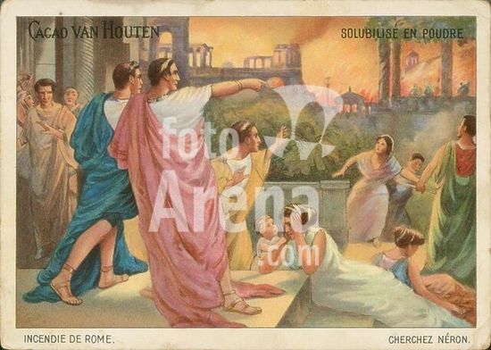 akg897962 Nero (Lucius Domitius Ahenobarbus), Roman Emperor (54-68); 37-68 AD.-"Incendie de Rome" (/64 n.Chr.; Nero sees the burning of Rome, and holds the Christians responsible). Colour lithography anon., French, c. 1900. Collectable picture from the firm "Cacao van Houten". From a series on historical events. Museum: Private Collection., Paris.
