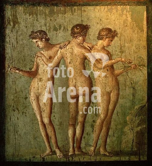 akg964515 Römisch, 50-79 n.Chr.-Wandmalerei "Drei Grazien".-Fresko, 60 x 53 cm. Fundort: Insula Occidentalis (VI), Pompeji. Inv.Nr. 9231. Museum: Museo Nazionale Archeologico., NEAPEL.