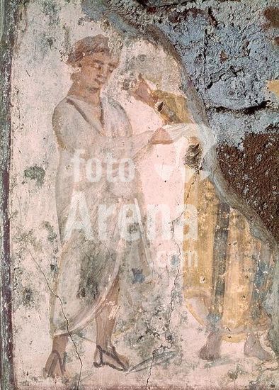 akg926727 Rom / Roma (Italien), Petrusund-Marcellinus-Katakombe / Catacomba dei Santi Pietro e Marcellino, Kammer XIV, Eingang, linke Wand.-Heilige und Orans.-Wandmalerei, frühchristlich, 4.Jahrhundert. 67 x 46 cm.