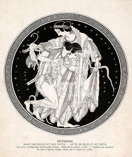 akg1619615 Griechische Vasenmalerei, attisch, rotfigurig, Maler Peithinos, um 500 v.Chr.-Peleus und Thetis. (Peleus umschlingt die ihm zur Gattin versprochene Göttin Thetis, die sich durch ihre Verwandlungskünste zu entziehen versucht.-/ Umrisszeichnung nach dem Innenbild der Schale (Kylix), gefunden in Vulci, in der ...