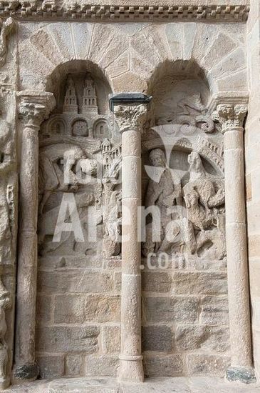 akg947102 Beaulieusur-Dordogne (Dép.Corrèze, Limousin, Frankreich), Abteikirche / Église abbatiale Saint-Pierre (um 1100 begonnen), Südportal, linke Innenwand des Portalvorbaus.-Daniel in der Löwengrube und Habakuk mit dem Engel.-/ Skulptur, um 1125. Foto, 2008. Aus der Serie: Sites clunisiens.
