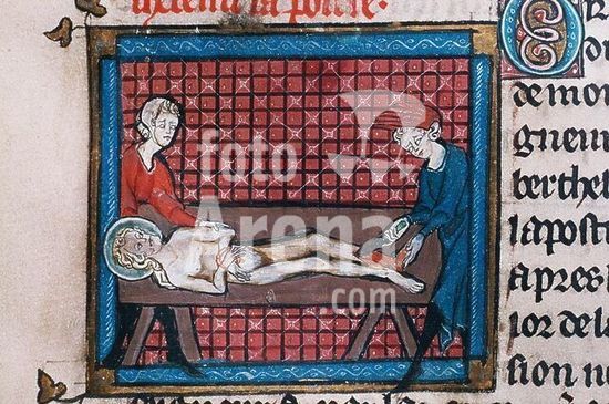akg1109646 Buchmalerei, Frankreich, 13. Jahrhundert.-Das Martyrium des heiligen Bartholomäus.-/ Ms. 588, fol. 22. Museum: Bibliothèque Sainte-Geneviève., Paris.