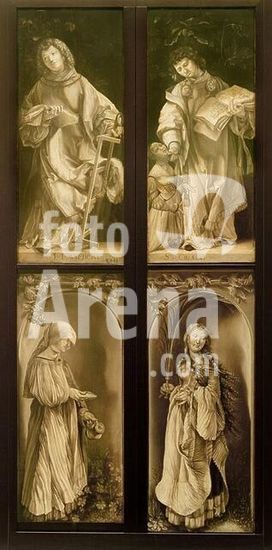 akg1032051 Grünewald, Mathis Gothart; um 1470/75-1528. /-Die Hll. Laurentius, Cyriacus u.Elisabeth sowie e.unbek.Märtyrerin.-Fragmente d.Heller-Altars. / Auf Tannenholz; Laur.: 99,1x43 cm, Cyr.:99,1 x42,8 cm, El.:95,8x42,8 cm, unbek.Märt.:101,2x 43,7cm. / Laur.u.Cyr.: Frankfurt/M., Städel Museum, Leihgabe d.Historischen Museums, Elisabeth und unbek.Märt.:. Museum: Staatliche Kunsthalle., Karlsruhe.