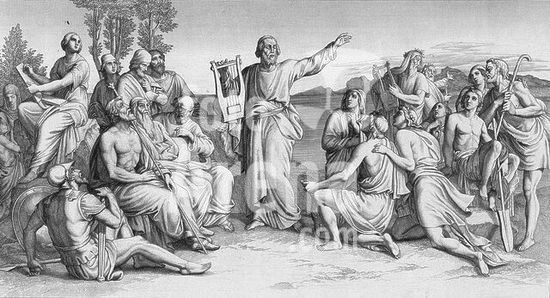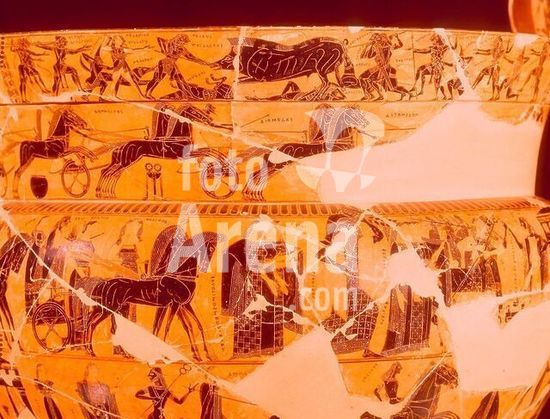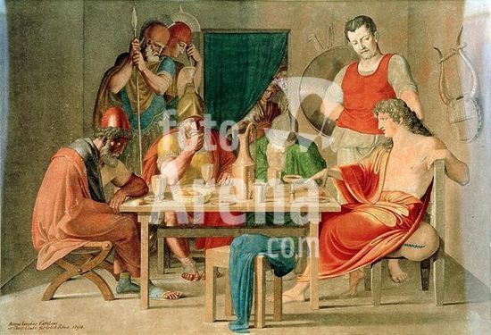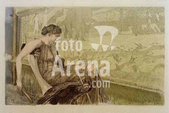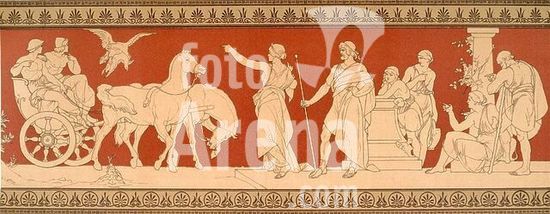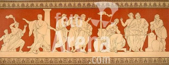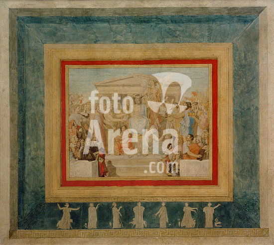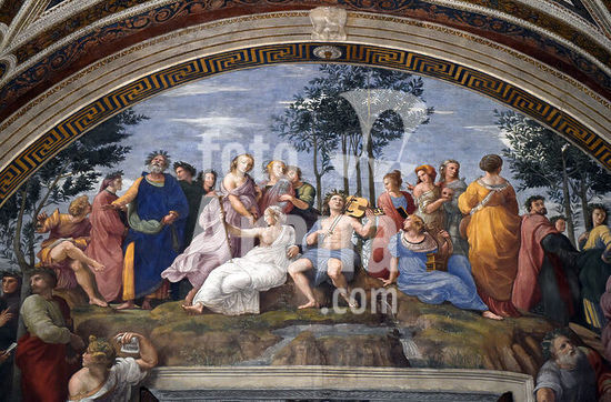 Partial view of the Parnassus (Le Parnasse, Parnass ). Painting by Raphael (Raffaello Sanzio, Raffael). The Parnassus is the dwelling place of the god Apollo and the Muses and the home of poetry, according to classical myth. Apollo (Apollon) seated at the centre, plays the lyre surrounded by the nine Muses, protectresses of the arts, and by ancient and modern poets, among whom (at left) Homer (Homere) (blind), Virgil (Virgile) and Dante Alighieri (Durante degli Alighieri) are easily recognisable behind him. - Painted in the Stanza della Segnatura (Room of the Signatura, Salle de la Signature, Saal der Signatur) between 1509 and 1511 as a part of Raphael's commission to decorate the rooms now known as the Stanze di Raffaello (Raphael Rooms, Chambres de Raphael, Stanzen des Raffael), in the Apostolic Palace in the Vatican. Vatican Museums. 2021.