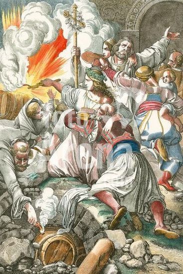 akg994655 Griechischer Unabhängigkeitskrieg: Einnahme von Missolunghi durch die Türken, 25. April 1826. Spätere Kolorierung.-"Unter dem Abzuge der tapfern Heldenschar aus der Stadt, zünden Frauen, Töchter und Greise die Minen und die mit Pulver gefüllten Gewölbe an". Federlithogr./Tonplatte, 1863, von Joh. Nepomuk Geiger (1805-1880).