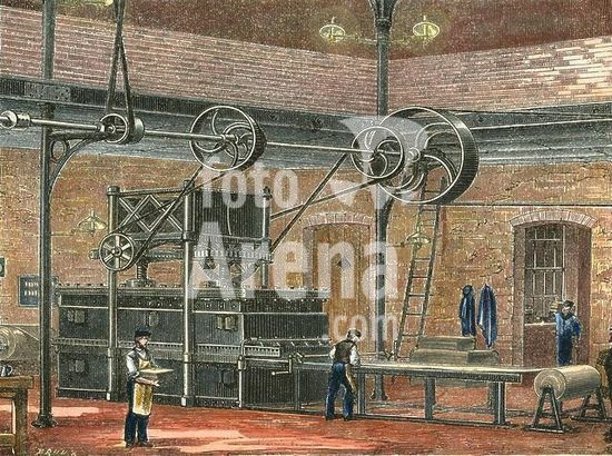 akg996407 Technik: Kautschuk.-Verarbeitung des Naturkautschuks in einer deutschen Kautschukfabrik: Apparat zum Vulkanisieren des Kautschuks.-Holzstich, 1867. Spätere Kolorierung.