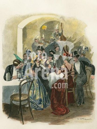 akg1064062 Kalenderfeste: Karneval.-"Im Bierstübl".-Holzstich nach Zeichnung, 1892, von Oscar Gräf (1861-1912). Aus einer Serie: Münchener Redouten. Spätere Kolorierung.