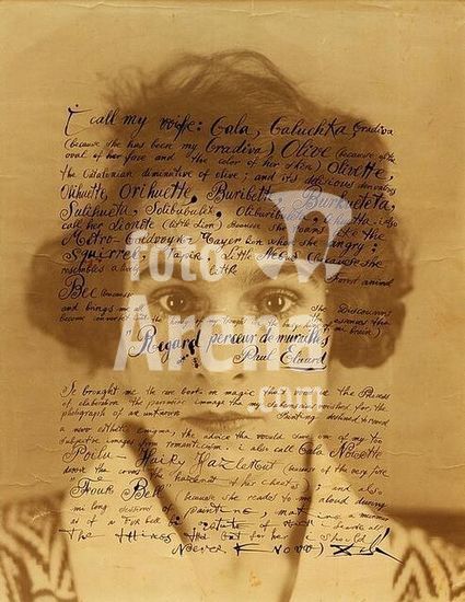 akg992807 Dalí, Salvador; 1904-1989. "Portrait de Gala avec écritures (Les noms de ma femme)" (Bildnis Galas mit Überschreibungen (Die Namen meiner Frau)), 1927/1932. Fotografie Man Rays aus dem Jahr 1927, von Dalí 1932 mit chines. Tinte mit Namen überschrieben, die Gala als seine Muse preisen. Museum: Private Collection., Privatsammlung.