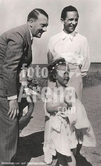 akg825684 Goebbels, Joseph; politician (NSDAP; Reich Minister of Public Enlightenment and Propaganda); 1897-1945.-"Urlaubstage auf Heiligendamm" (Holiday in Heiligendamm).-(Goebbels with his second oldest daughter Hildegard, left Adolf Hitler). Photo postcard, undated.