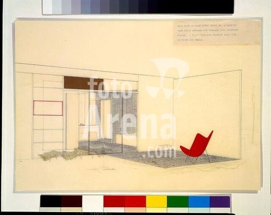 akg1448207 Eames, Charles (Ormand); USamerikan. Designer und Architekt; St.Louis (Mo.) 17.6.1907-ebd. 21.8.1978.-"Case Study House No.9" für John Entenza, Pacific Palisades, Los Angles, Kalifornien, USA: Blick von der Sonnenterrasse mit Hardoy-Sessel in das Badezimmer.-Zeichnung, um 1947/49, von Charles Eames. Bleistift, Farbstifte ...