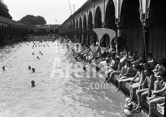 akg986055 Paris (Frankreich), Piscine Deligny (Freibad an der Seine, Quai Anatole France; in der Belle Époque angelegt, Anfang 1990er Jahre geschlossen).-Blick auf das Schwimmbecken.-Foto, 24.05.1953.