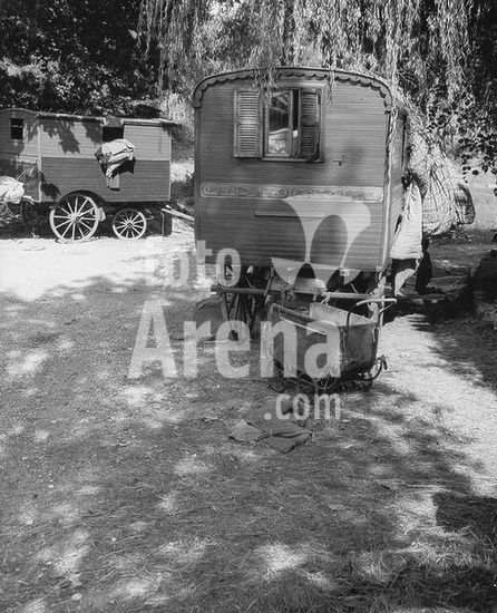 akg1517315 Völkerkunde: Sinti und Roma.-Romalager in der Nähe von La Gaude, im Hinterland von Nizza: zwei Wohnwagen.-Foto, 1950er Jahre. Vintage print, 24,5 x 20 cm.