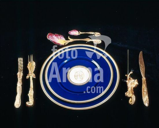 akg1673386 Dali, Salvador; 1904-1989.-Achtteiliges Gedeck.-Entwurf: 1965. Silber, feuervergoldet. Collection Mafalda Davis, Paris.