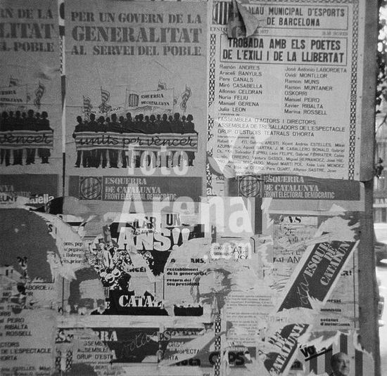 akg1079055 Spanien / Transition (Transición; Übergangsphase zwischen dem Tod Francos 1975 und der Wende von 1982) / Kampf Kataloniens um die politische Automonmie .-Plakate der katalanischen Linkspartei "Esquerre de Catalunya" an einer Hauswand in Barcelona.-Foto, 1977.