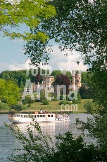 akg433815 Potsdam (Brandenburg), Babelsberg Castle. (Design 1833 by Karl Friedrich Schinkel, partially constructed 1834-35; extensions 1844-49 by Johann Heinrich Strack).-View over the Tiefen See with the pleasure boat 'Fridericus Rex' towards Babelsberg Castle.-/ Photo, 2005.