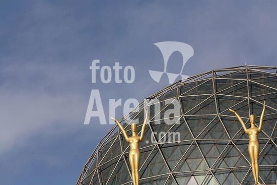 akg599275 Figueras (Katalonien, Spanien), Museu Dali (urspr.Theater, Umbauten nach Entwürfen Salvador Dalis; Arch.: Perez Pinero).-Vergoldete Skulpturen vor der Kuppel des Dali-Museums.-Foto, undat.