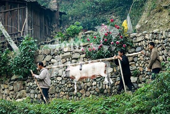 akg864271 Völkerkunde / China.-Miao (ethnische Minderheit in der Provinz Guizhou): Männer tragen ein geschlachtetes Schwein als Opfergabe im Miao-Dorf Xijiang.-Foto, undat.