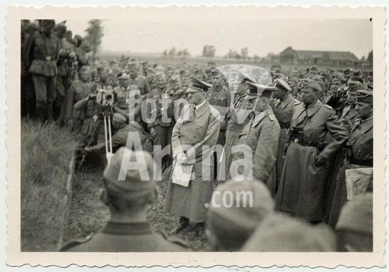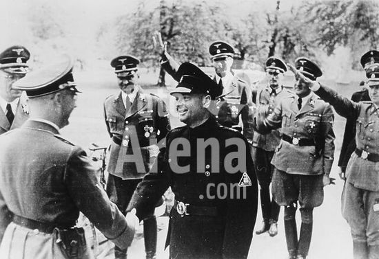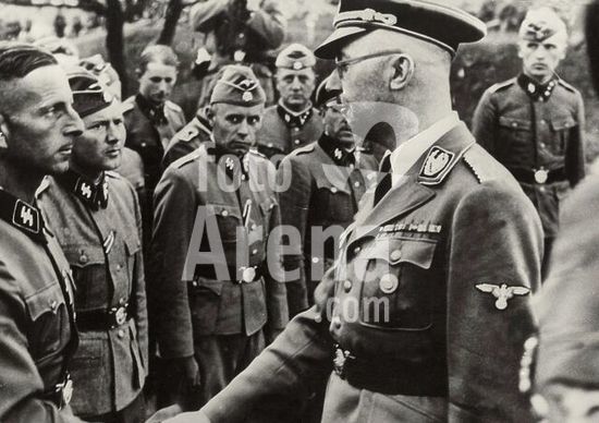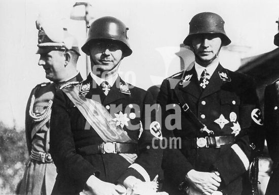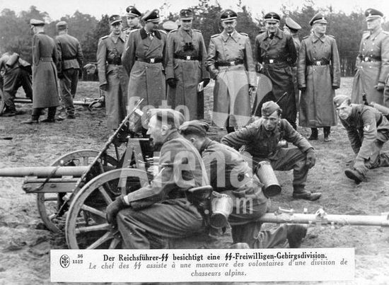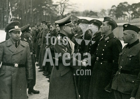 akg357752 Himmler, Heinrich, politician (NSDAP), Munich 7/10/1900 - (suicide) near Lüneburg 23/5/1945. Himmler (background, 4th f. r.) inspects a SS volunteer mountain division during World War II. Photo, undated.