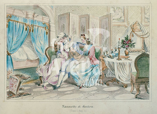 akg019449 Casanova, Giacomo 1725-1798. Writer. Works: Memoirs. "Nannette et Marton" (Part 7, Chap. 2). Illustration by Julius Nisle. Lithograph, coloured, 13 × 20cm. From the series: Galerie zu den Memoiren des (...) Casanova, c. 1850.