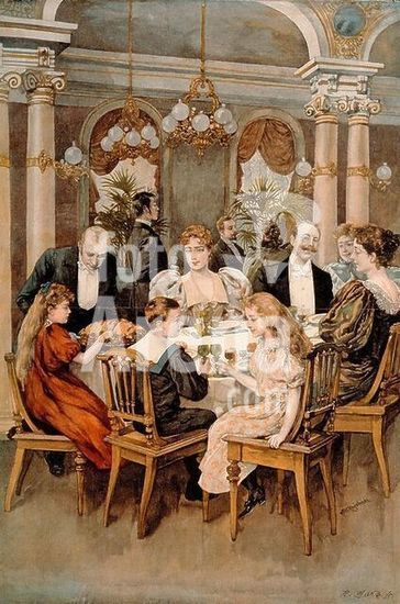 akg026997 Gastronomy:. Restaurant. "The Banquet (Christmas meal) ". Col. wood eng., c. 1900, after a drawing by Stanislaw Rejchan (born 1819).