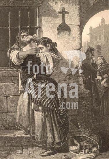 akg034191 Recht:. Gefängnis / Besuch. "Das Kerkerfenster". Stahlstich, um 1850, von Veit Froer. (geb. 1828) nach Gemälde von John Phillip. (1817-1867). 17,7 × 12,3 cm. Berlin, Sammlung Archiv für Kunst und Geschichte. Museum: Berlin, Sammlung Archiv für Kunst und Geschichte.