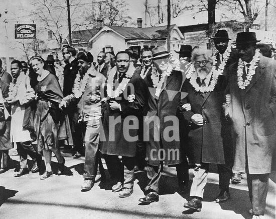 akg077448 USA / Civil rights movement:. Demonstration march from Selma (Alabama). to the Capitol in Montgomery, 27th (?). March 1965. Martin Luther King (4th f. right), Ralph Bunche, Secretary of the United Nations (3. f. right) and between the two Don Slaiman from the AFL-CIO. Photo.