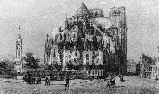 akg083925 Paris, Notre Dame. (1163 begonnen). Ansicht von Osten (Chor). Stahlstich, um 1840.