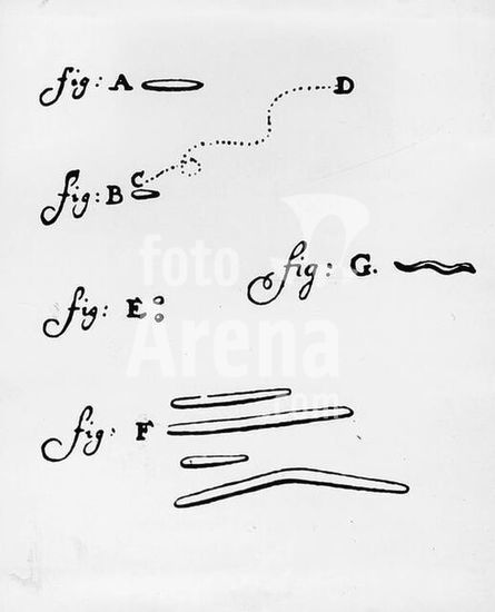 akg087536 Leeuwenhoek, Antonie van; Dutch tradesman and scientist (considered to be the first microbiologist). 1632-1723. "Levende Dierkens" from the roof of the mouth. (First depiction of bacteria). Engraving after a drawing by Leeuwenhoeks.