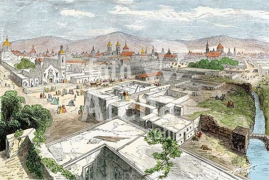 akg1112665 Central plaza of Mexico City in the mid-1800s. Handcolored woodcut of a 19thcentury illustration.