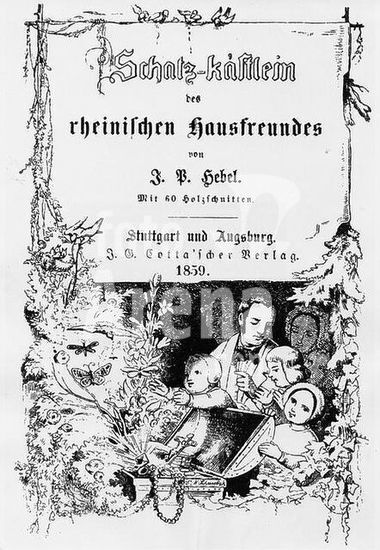 akg113304 Hebel, Peter (Johann Peter); Dichter. 1760-1826. Werke: Schatzkästlein des rheinischen Hausfreundes (1808-1811). Titelblatt der Ausgabe Stuttgart und Augsburg (J.G.Cotta'scher Verlag) 1859.
