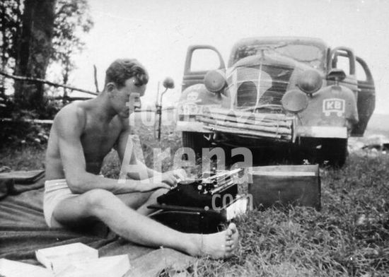 akg117682 History: World War II / Eastern Front. German war reporter Baumann with his typewriter. Photo, 1941 (?).