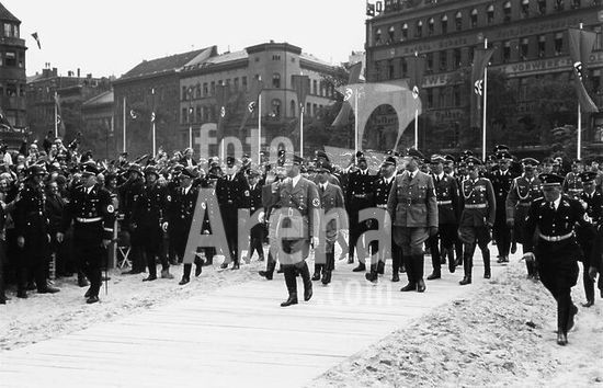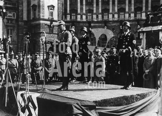 akg161710 Austrian Anschluss (annexation) to the German Reich. (12th March 1938) /. Austrian Police swearing oath of allegiance to the Fuehrer, 15.3.1938. - Reichsführer SS and head of the German Police, Heinrich Himmler (right). and General of the Police Daluege at the oath-swearing. (standing, half hidden).- Photo.