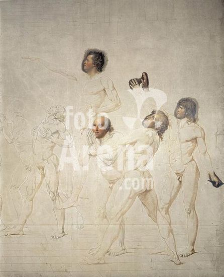 akg136575 French Revolution. "The Tennis Court Oath." (Versailles, 20 June 1789). Unfinished painting, 1791, by Jacques-Louis David (1748-1825). (from left Dubois-Crance, Pere Gerard, Mirabeau and Barnave). Oil on canvas, 400 × 600cm. Versailles, Château et Trianons. Museum: Versailles, Château et Trianons.