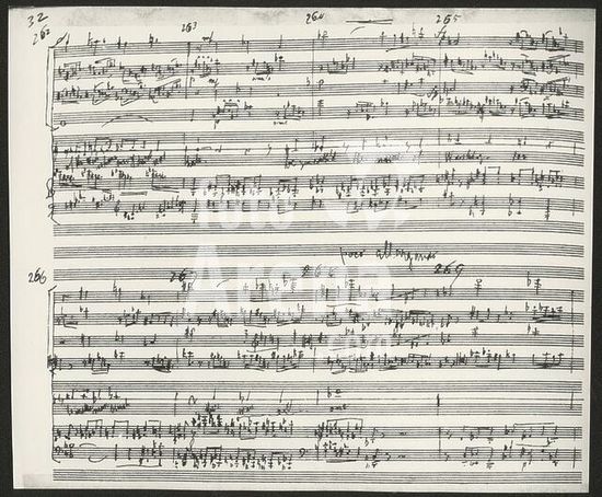 akg142847 Schoenberg, Arnold; German composer. 1874-1951. Work: Ode to Napoleon, op. 41 (for reciter, string quartet and piano; text: Lord Byron; 1942). Page of the autograph manuscript.