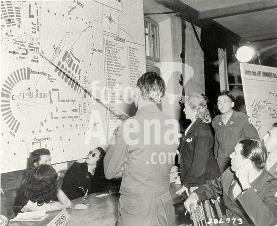 akg143542 War crimes trials before a US military trubunal in Dachau, from 15/11/1945. Buchenwald Trial:. The defendant Ilse Koch, wife of the Buchenwald concentration camp commander Karl Koch, giving evidence in front of a plan of the camp. Photo, 8 July 1947.