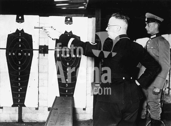 akg148929 Himmler, Heinrich Politician (NSDAP; Head of the SS). 1900-1945. Police shooting range in Berlin-Wannsee 1934: Heinrich Himmler fires a pistol. Photo.