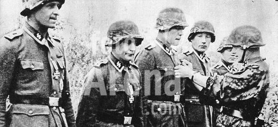 akg152298 History / World War II / Auxiliary troops. - Members of a Latvian unit of the Waffen-SS are awarded the Iron Cross. PK (propaganda) photo (Buzenick), 1944. From: the magazine "Signal", French edition, vol. 5, issue 7, 1944, p. 8.