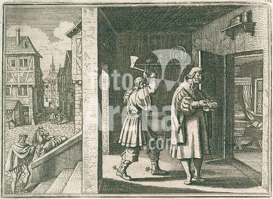 akg171980 Droit / Meurtre. Alphonse Diazius (professeur de droit) assassine son frère Jean pour s'être converti au protestantisme, à Neuburg pendant qu'il traduit un ouvrage de Bucer (1546). Gravure sur cuivre de Matthäus Merian l'ancien (1593-1650). In : Johann Ludwig Gottfried, Historica Chronica, Francfort / Main (M.Merian) 1630, p. 772. Berlin, Sammlung Archiv für Kunst und Geschichte. Museum: Berlin, Sammlung Archiv für Kunst und Geschichte.