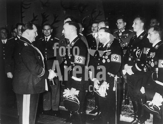 akg197526 Göring, Hermann Politician (NSDAP), politician 1893-1946. - Göring's 45th birthday 12.1.1938:. left to right H. Himmler, Kurt Daluege. (covered), SS-Obergruppenführer Sepp Dietrich, SS-Gruppenführer Reinhard Heydrich and SS-Obergruppenführer Wolff congratulating. Photo.
