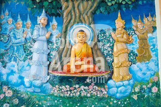 akg2132863 Painting depicting the life of Buddha on a prayer hall wall, Shwedagon Pagoda, Yangon, (Rangoon), Myanmar, (Burma).