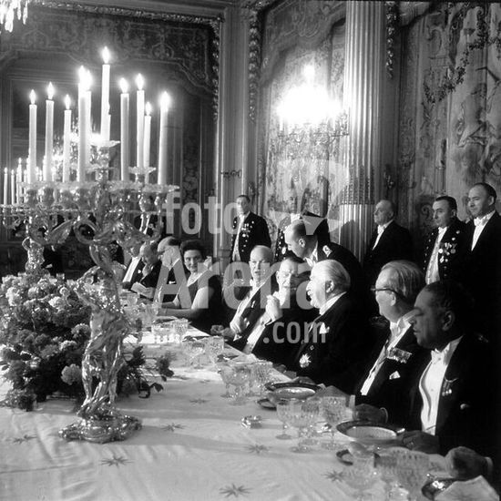 akg222712 re: Coty, Rene French politician (Independent Republicer; a. o. 1953-59 President of Republic); 1882-1962. Diner in Elysee-Palast in Paris: Pres. Coty (4. f. r.), the American Pres. Eisenhower (5. f. r.), J. Bech, Prime Minister of Luxembourg (3. f. r.) a. o. Photo, 1955. Copyright: Not available for licensing for prints or posters.