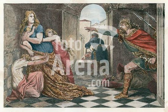 akg2325215 Brunehaut (ou Brunehilde) ; reine des Francs ; fille du roi wisigoth Athanagilde et de la reine Goïswinthe, mariée en 567 à Sigebert Ier d'Austrasie, en 575 à Mérovée de Neustrie ; v. 545/50 - 613 (assassinée). "Brunehaut est attaquée à Paris par Chilpéric". Gravure sur bois d'ap. dessin de Hermann Knackfuß (1848-1915). In : W.Zimmermann, Geschichte des deutschen Volkes (histoire du peuple allemand), Stuttgart 1873. Coloration ultérieure.
