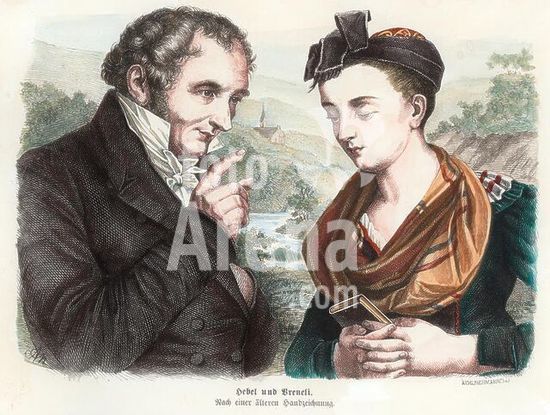 akg2354391 Hebel, Peter (Johann Peter). Dichter, 1760-1826. - "Hebel und Vreneli" (Veronika Rohrer, 1779-1869). Holzstich nach Zeichnung, um 1860. Spätere Kolorierung.