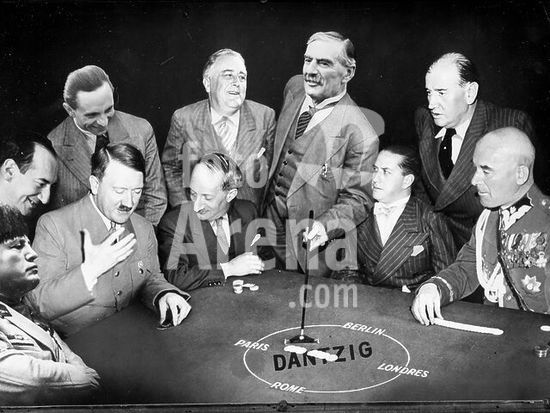 akg236604 Troisième Reich, août 1939. Crise de Dantzig et du corridor polonais. - "Affaire de Dantzig" (caricature: les hommes d'état et min. des Aff. étrang. européens et le prés. amér. Roosevelt à la table de jeux (Mussolini, Hitler, Bonnet, comte Ciano, Rydz-Smigly...). Photomontage (attribué à) Marinus Jacob Kjeldgaard (1884-1964), non daté. Copyright: Marinus Kjeldgaard's artistic copyright cleared via akg-images. This artwork is not in the public domain. akg-images represents the artistic copyright of this artist, please contact us from more information and to clear the necessary permissions.
