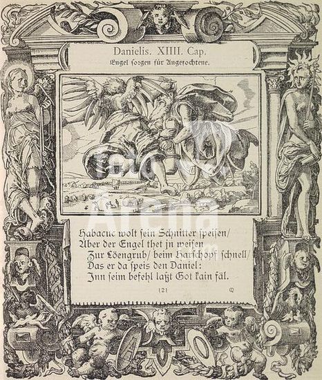 akg240000 Stimmer, Tobias. 1539-1584. Ein Engel trägt den Propheten Habakuk am Schopf zu Daniel in der Löwengrube. (Daniel 14,1-38). Holzschnitt. Aus: Johann Fischart, Biblische Historien, Basel (Thomas Guerin) 1576, Nr. 121.