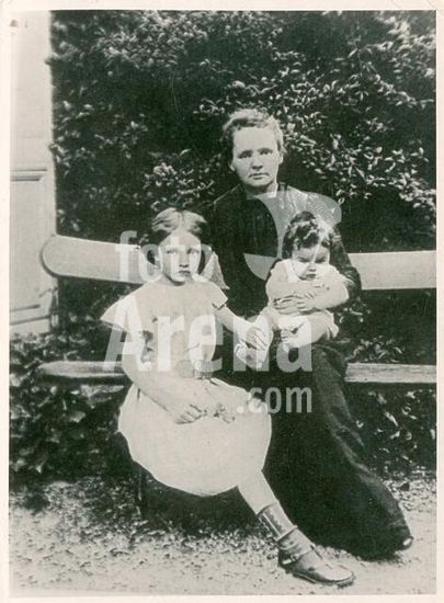 akg2436986 Curie, Marie, geb. Sklodowska. Chemikerin (Nobelpreis 1911); Warschau 7.11.1867 - Sancellemoz. (Schweiz) 4.7.1934. Madame Curie mit ihren Töchtern Irene und Eve. Foto, 1905.